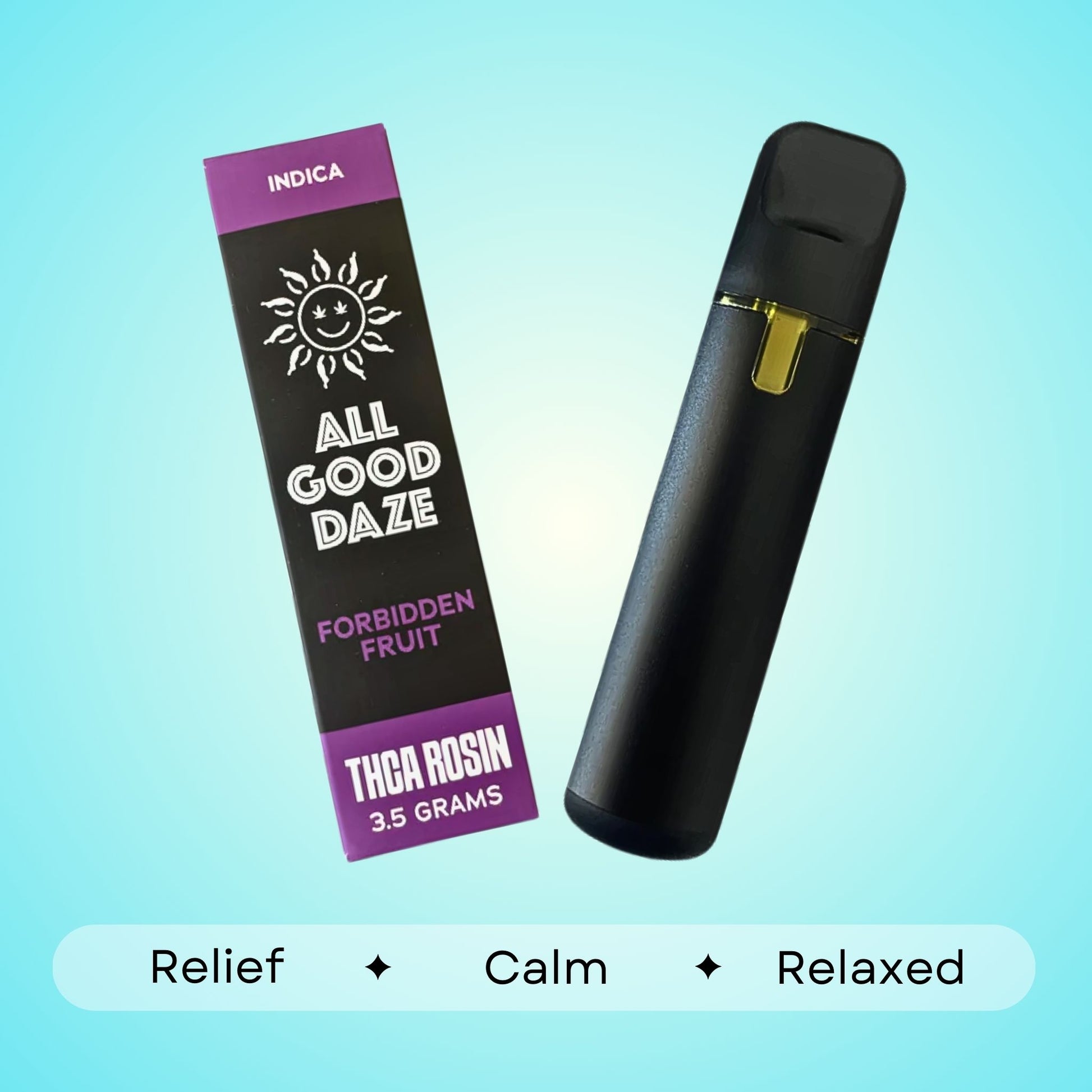 Forbidden Fruit is the ideal indica for full-body calm and mental tranquility. Crafted from pure THCA live rosin, the F*KD Exotics disposable delivers rich, smooth flavor and potent effects that ease the mind and relax the body. With no distillate or additives, this 3.5g device delivers a true full-spectrum experience. Whether you’re winding down solo or passing it around in a relaxed setting, this vape is made for indulgent, end-of-day relief.