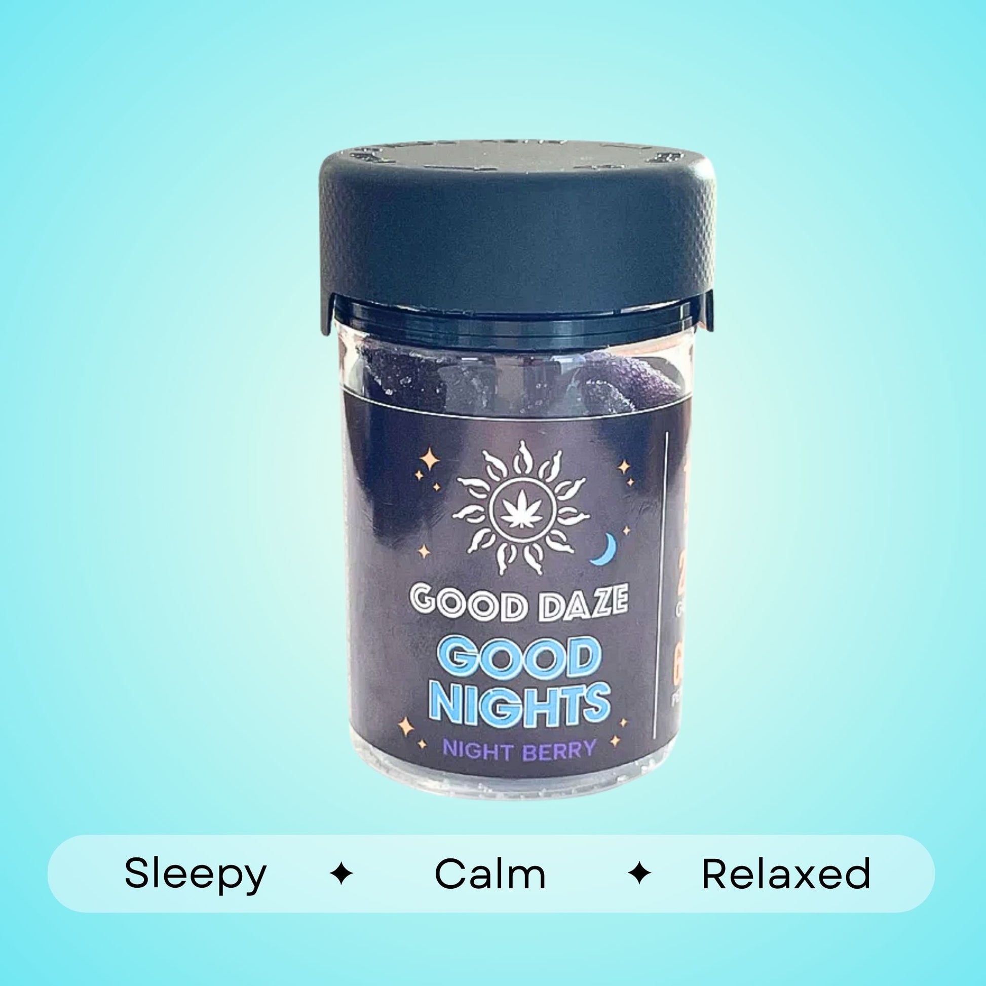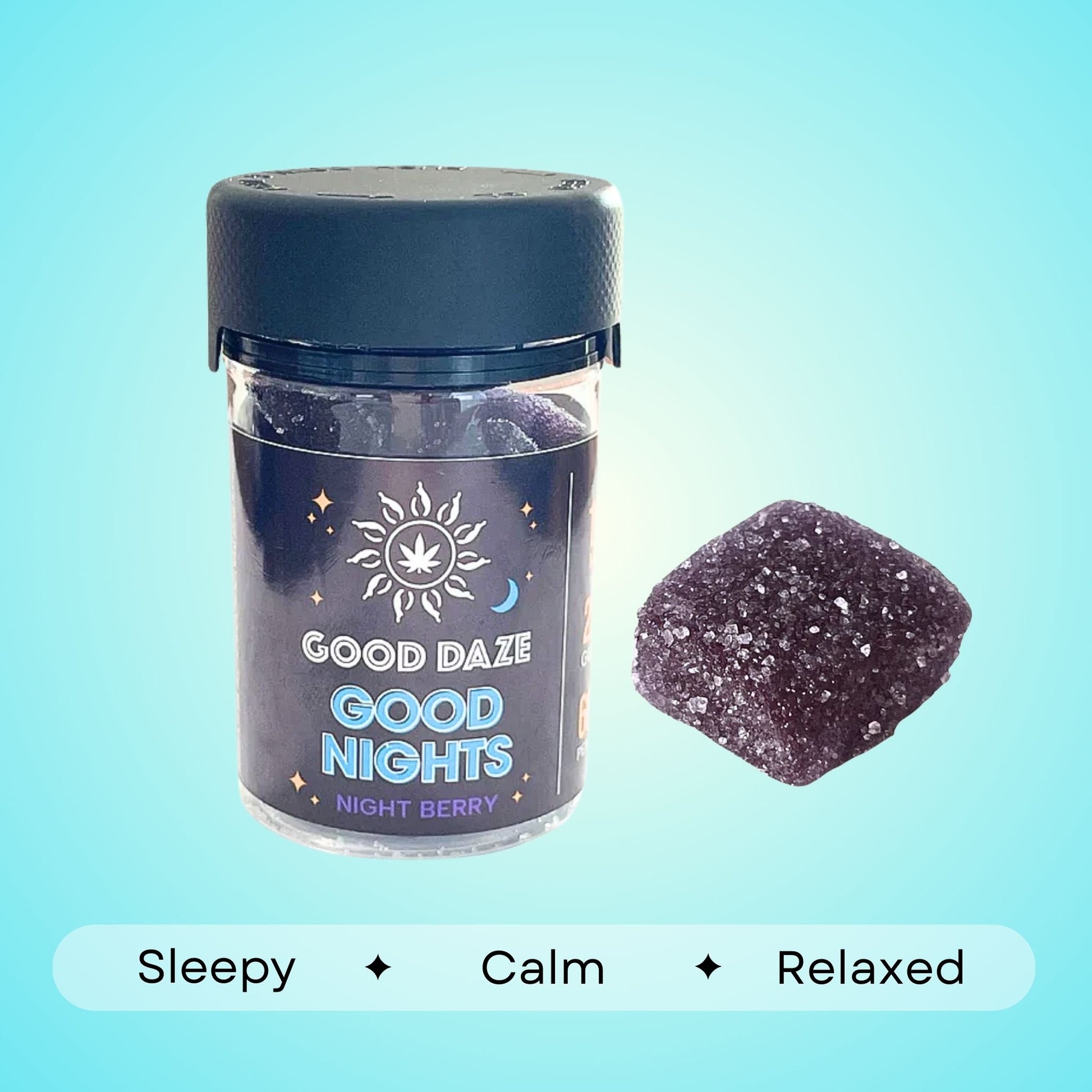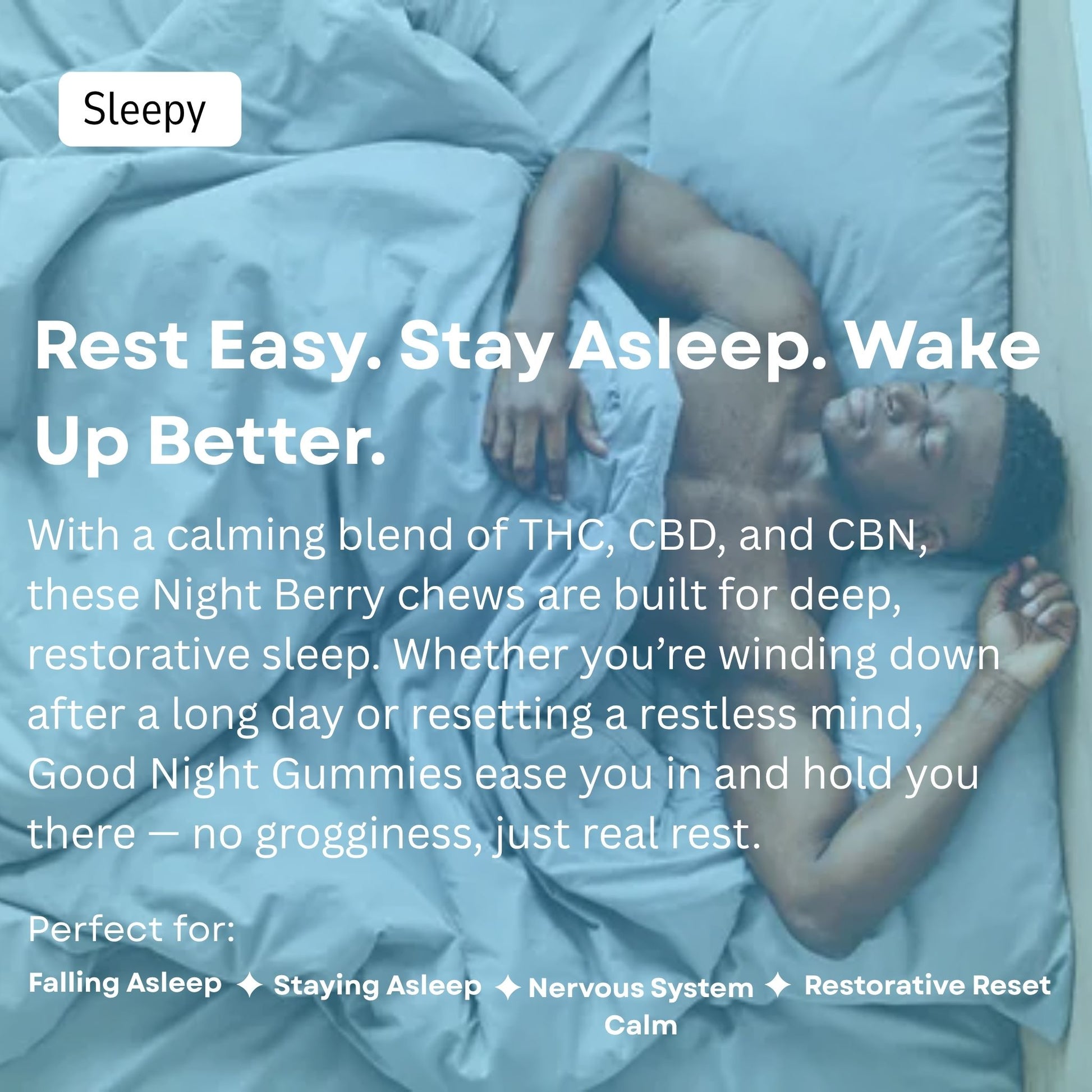 Good Night Gummies are crafted to help you fall asleep faster and stay asleep longer. Each gummy delivers a potent trio of cannabinoids: CBN to promote restful sleep, THC to sustain it, and CBD to relax the nervous system and amplify the effects. The smooth Night Berry flavor makes bedtime a little sweeter. Vegan and gluten-free. Best taken an hour before bed—start with half if you’re new to nighttime edibles.