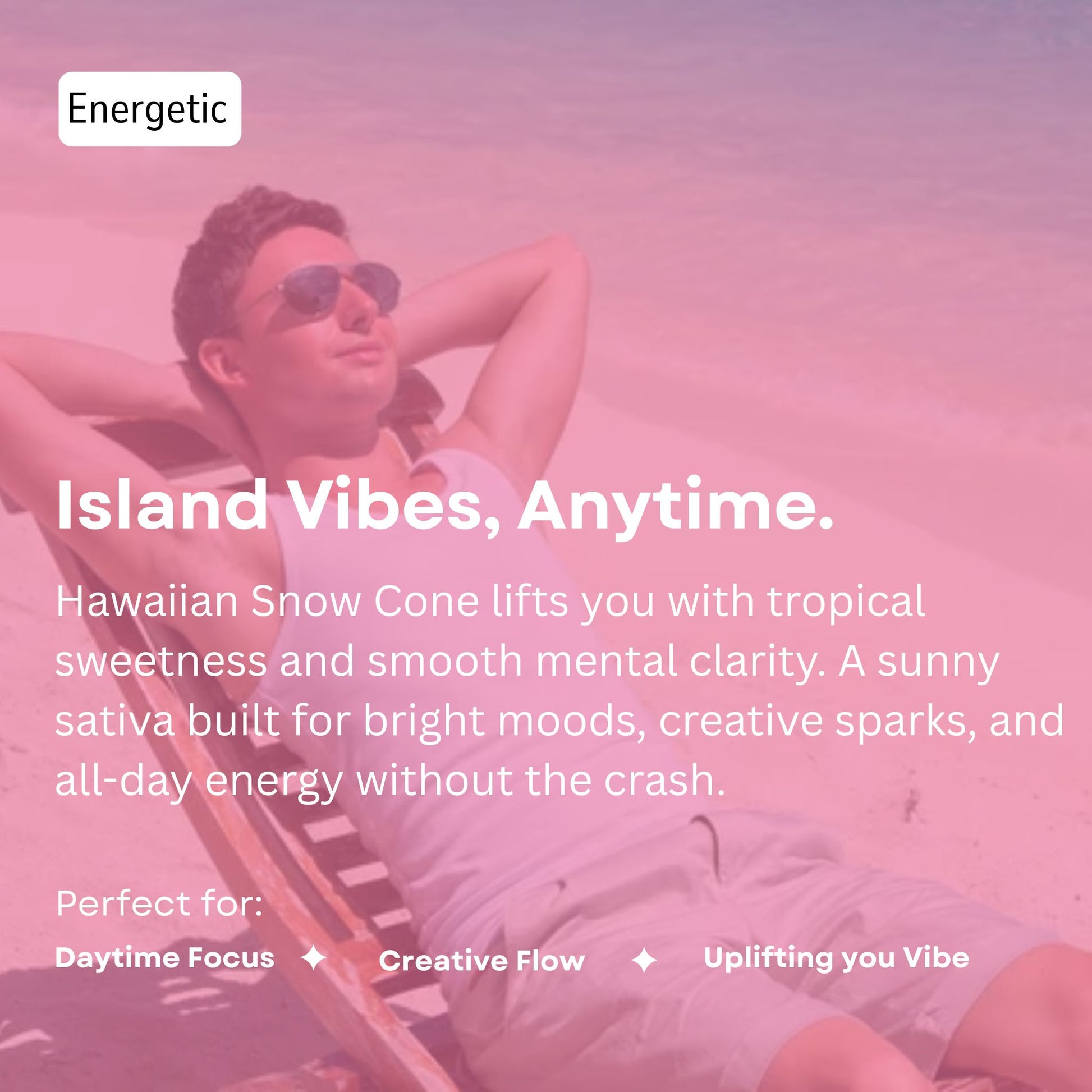 Hawaiian Snow Cone is a bright, tropical sativa that delivers smooth cerebral energy and laid-back clarity. Perfect for creative sessions, outdoor adventures, or boosting your mood, this strain brings the essence of an island escape to every hit—without overwhelming the mind.