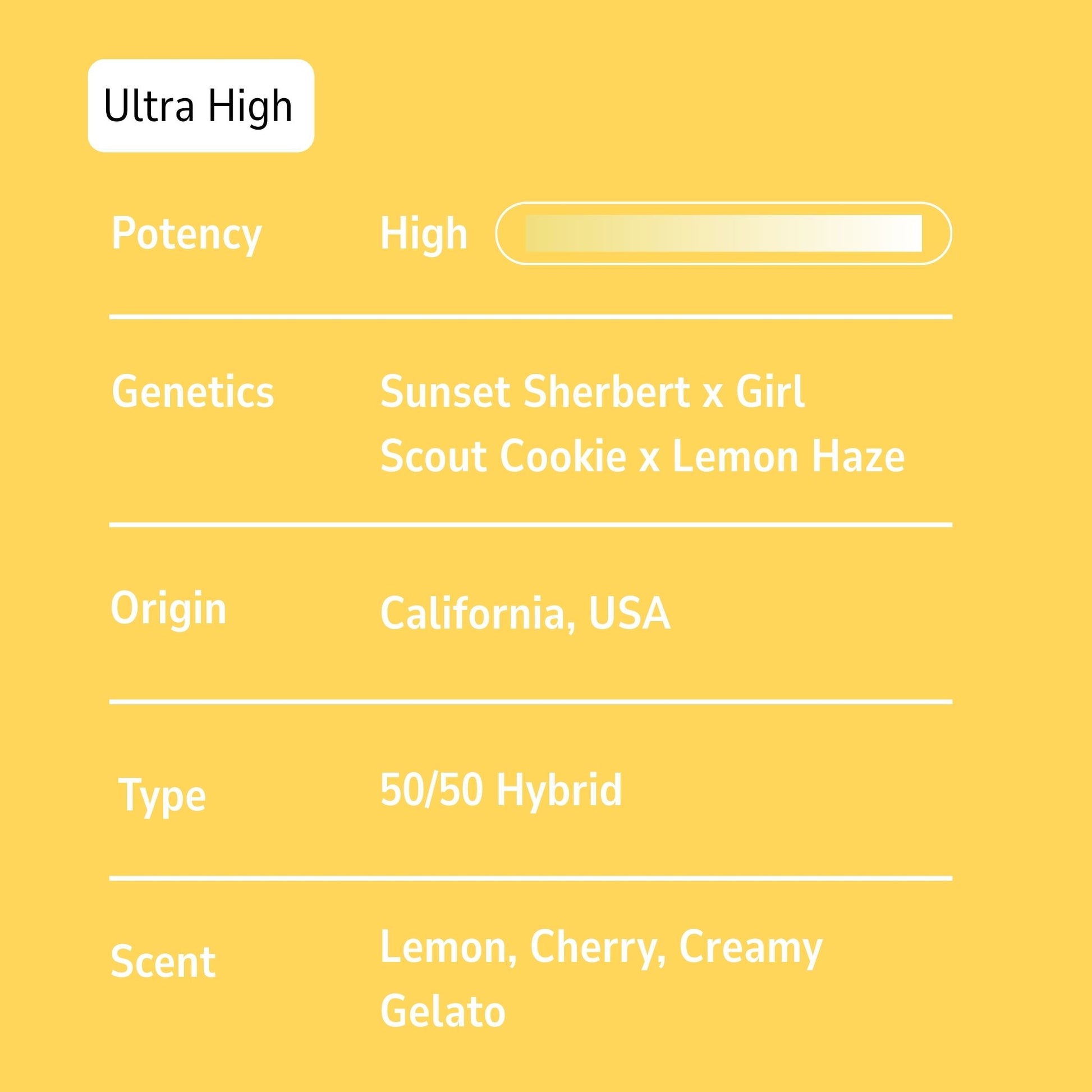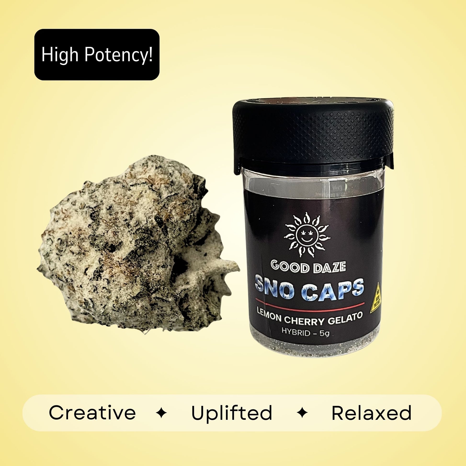 Lemon Cherry Gelato Snow Caps offers a sweet citrus burst with creamy cherry undertones and a potent, balanced high. It starts with a wave of happiness and creativity, then melts into calm, feel-good relaxation. Ideal for unwinding or sparking joy with friends.