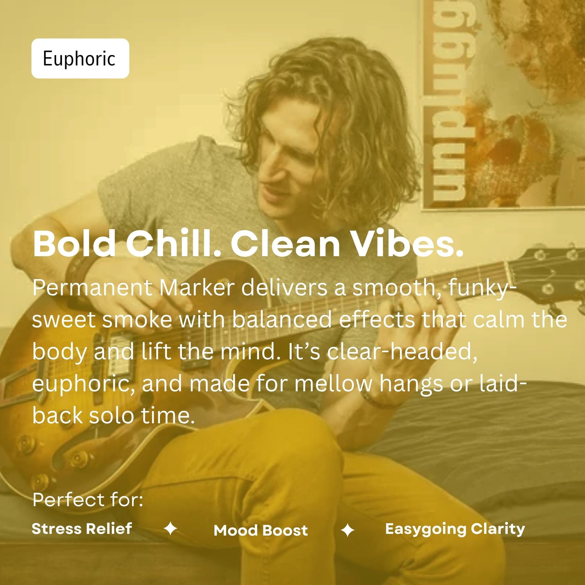 Permanent Marker is all about leveling up your chill without weighing you down. Expect a clear-headed, smooth high with just enough body relaxation to ease the stress — perfect for solo sessions or passing it around with the crew. With its bold flavor and clean energy, this flower hits just right: never too heavy, never too light.