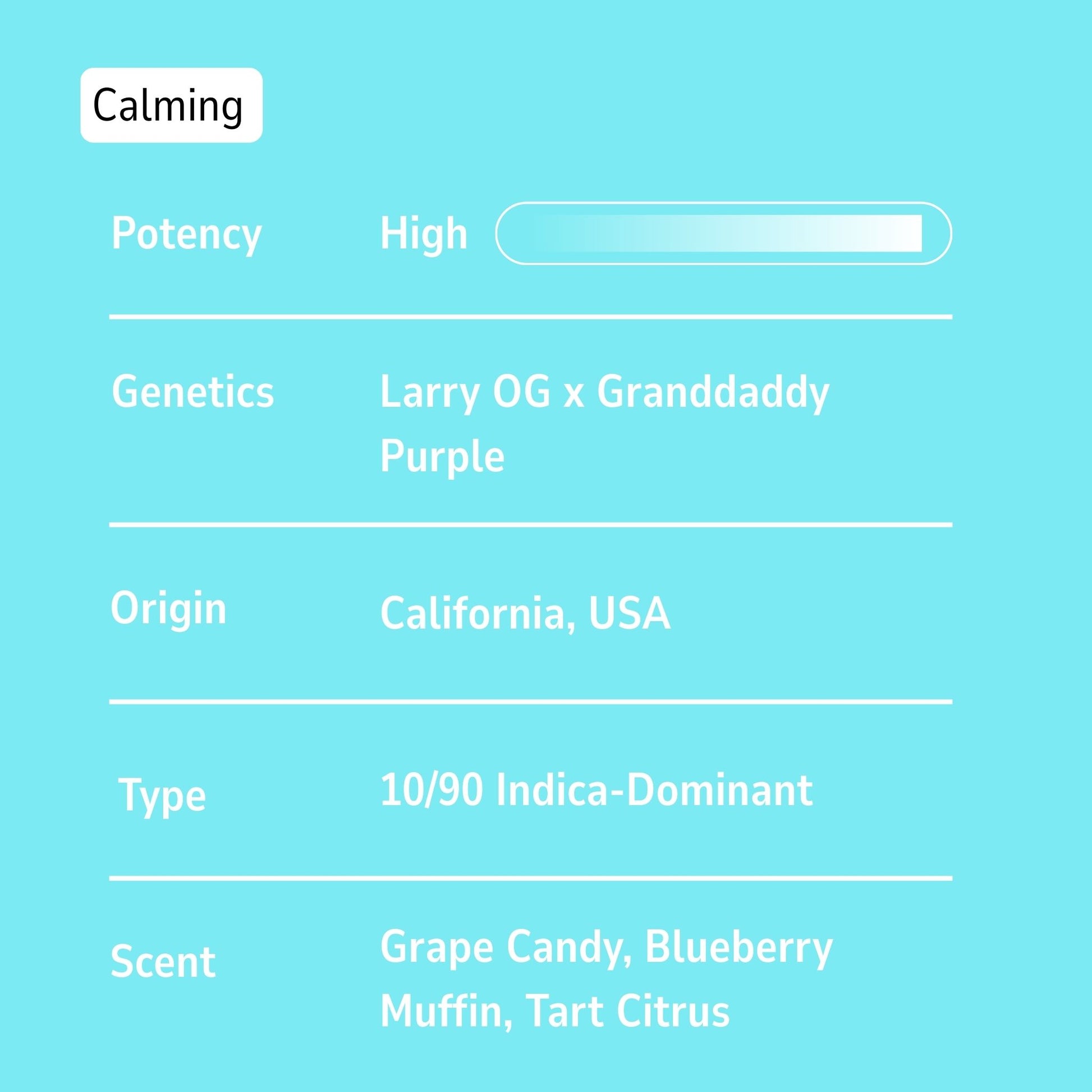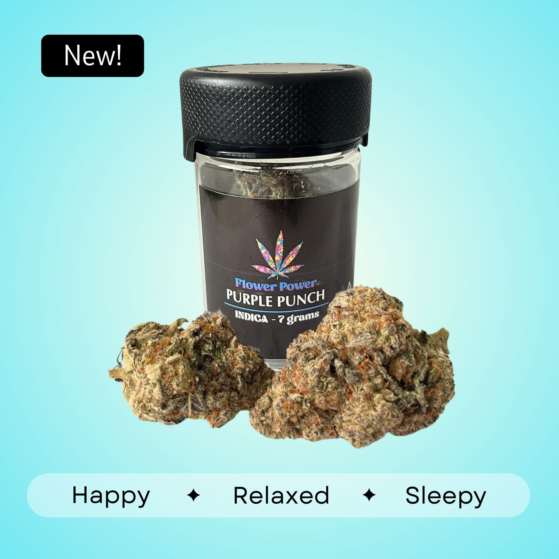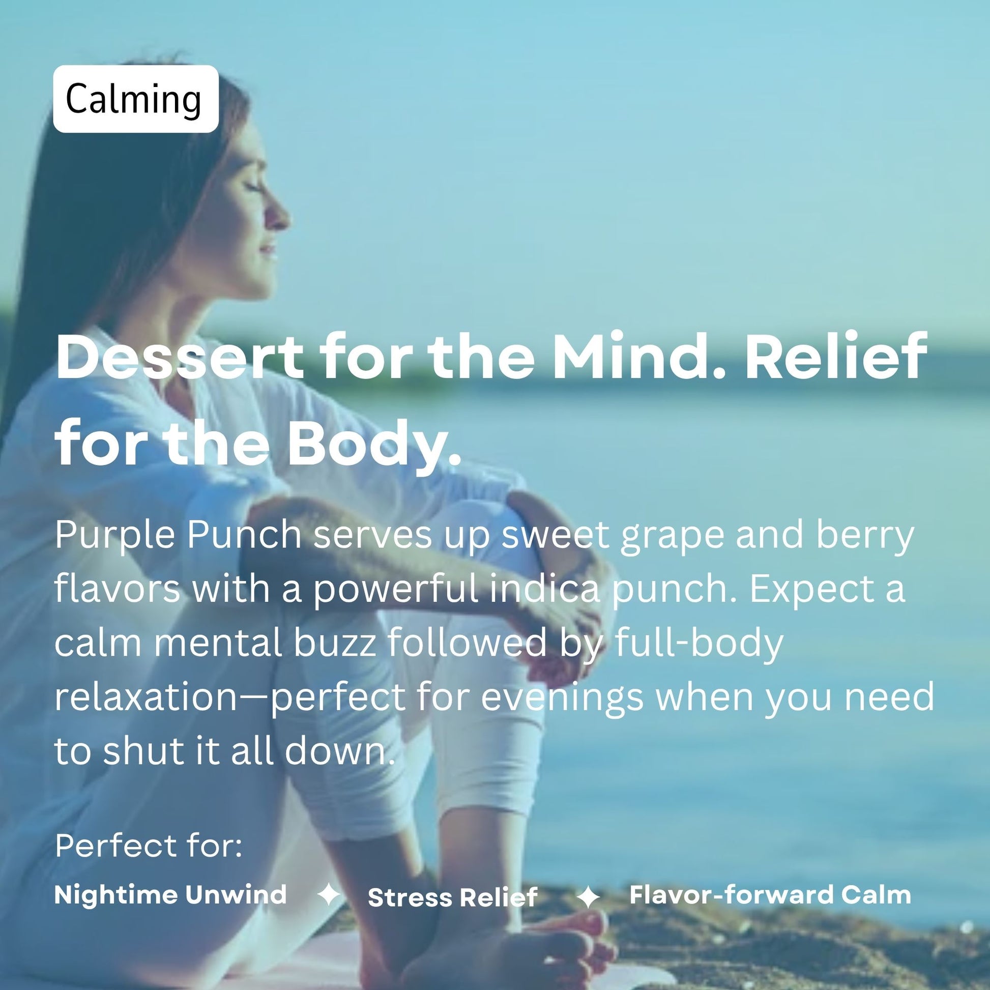 Purple Punch is a flavorful indica that hits with a sweet, dessert-like profile and delivers a deeply calming body high. The effects start with a light cerebral buzz and quickly melt into full-body sedation. Ideal for winding down at night or relieving tension and discomfort.