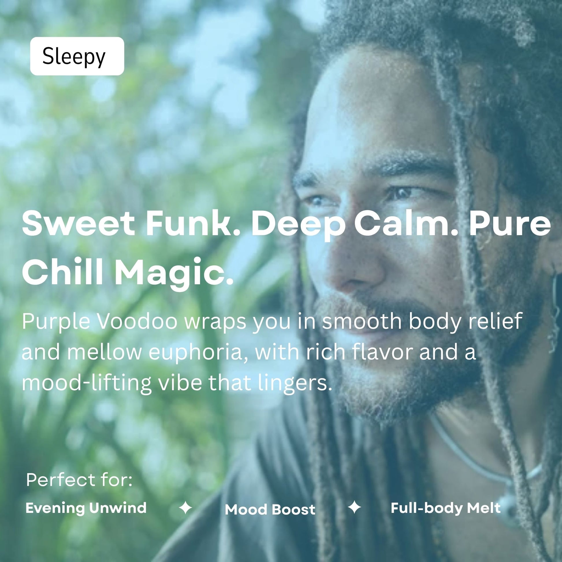 Purple Voodoo enchants with deep indigo buds and a sweet, funky aroma that draws you in from the first hit. This groovy indica casts a mellow, euphoric spell, delivering full-body relaxation and an uplifted mindset. With rich terpenes like caryophyllene and limonene, it's ideal for unwinding, vibing out, or reaching a higher state of chill.