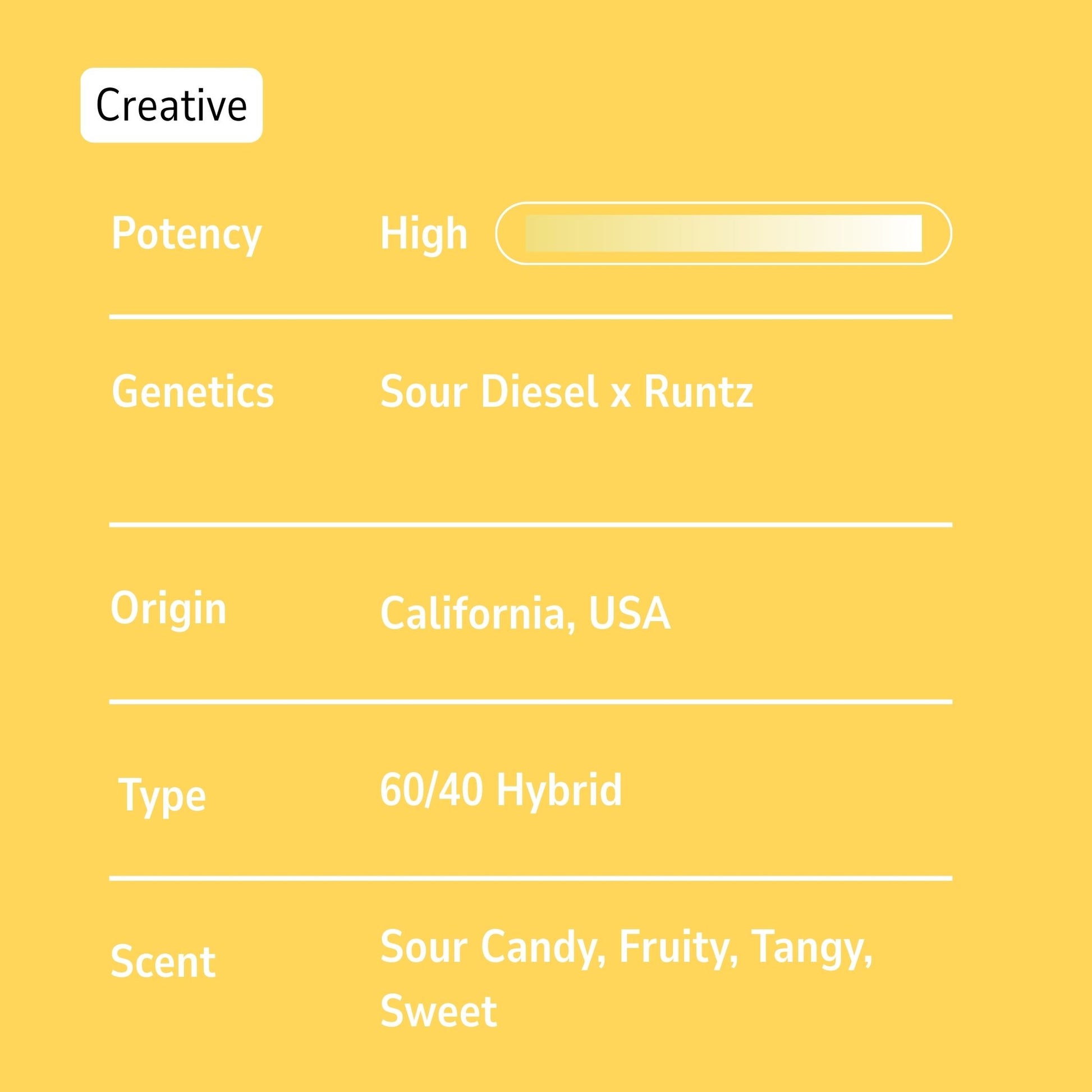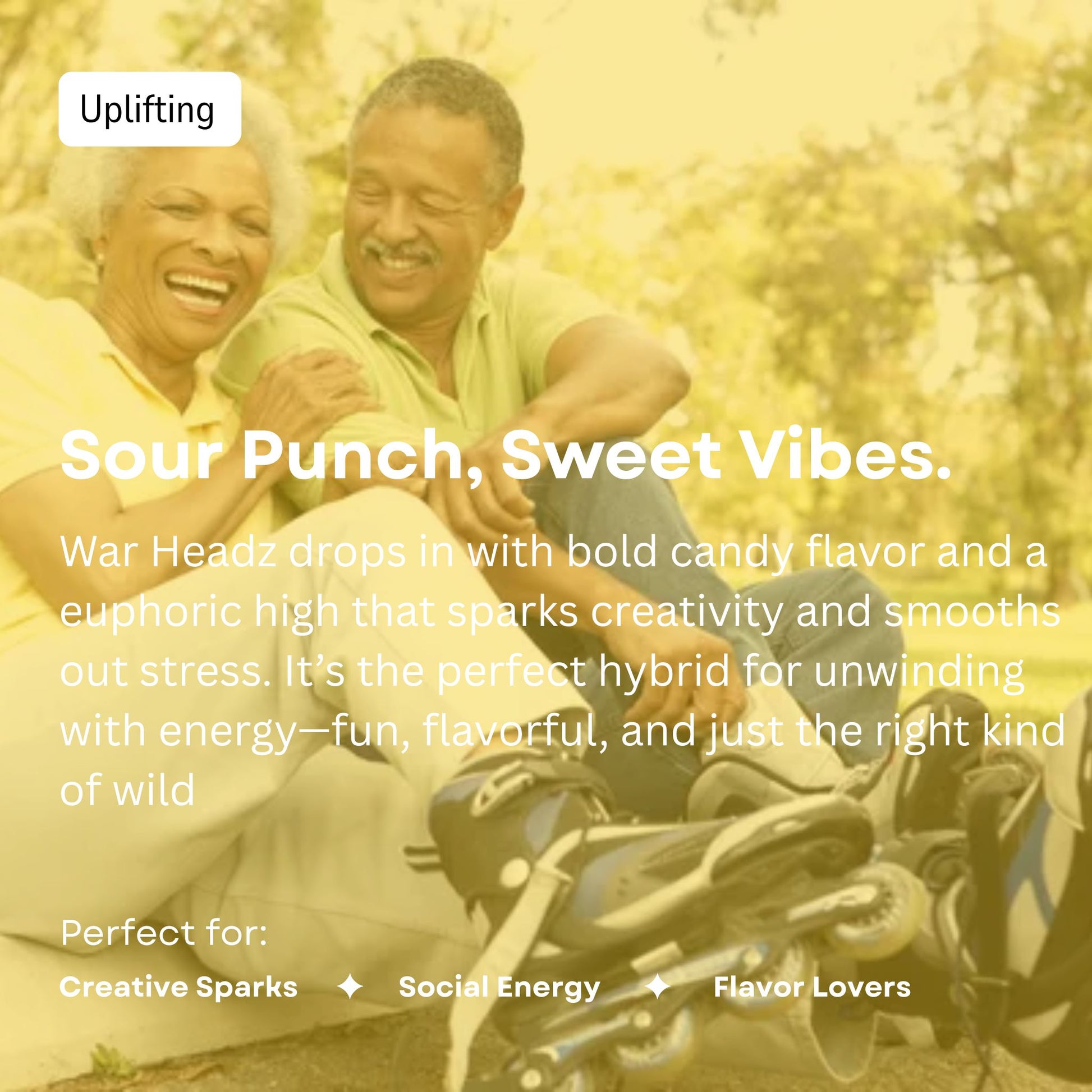 War Headz is a bold hybrid with a sour-candy punch and fruity sweetness that lights up the senses. It hits with an uplifting cerebral buzz followed by smooth, calming body effects — perfect for creativity, laughter, or winding down without being couch-locked. A flavorful, balanced strain that lives up to its name.